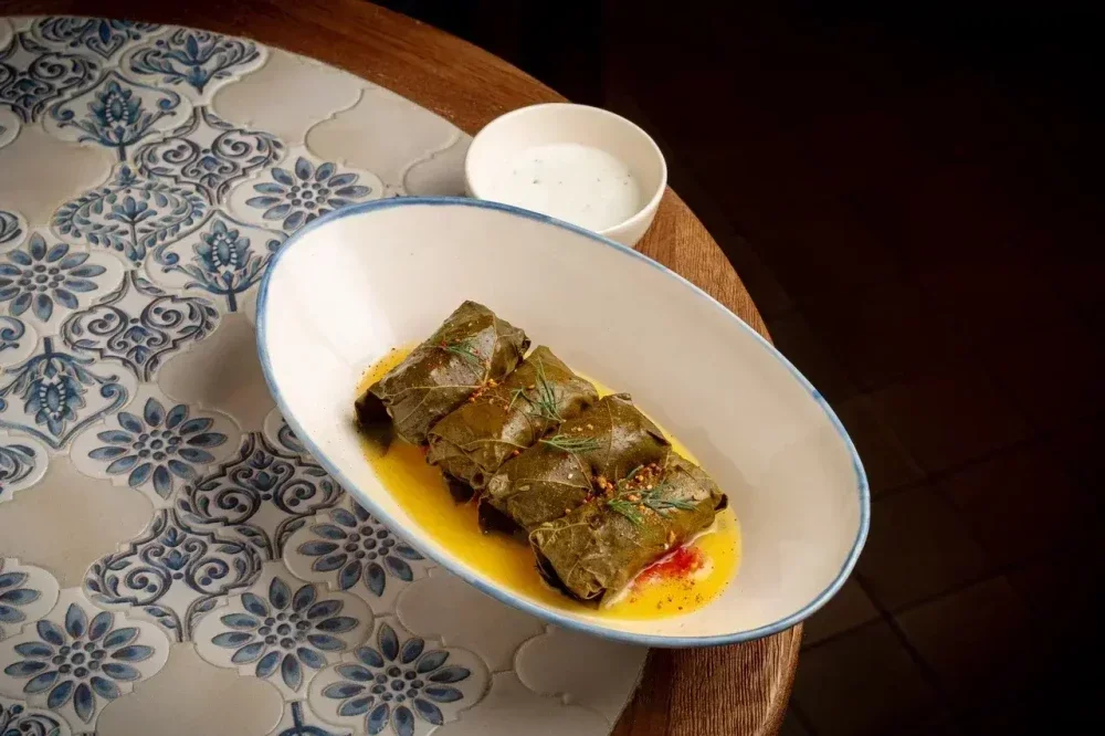 Нежные виноградные листья с начинкой из томлёной говядины. Подаются с йогуртовым соусом, томатной сальсой и ароматным чесночным маслом. Сверху украшается свежим укропом.