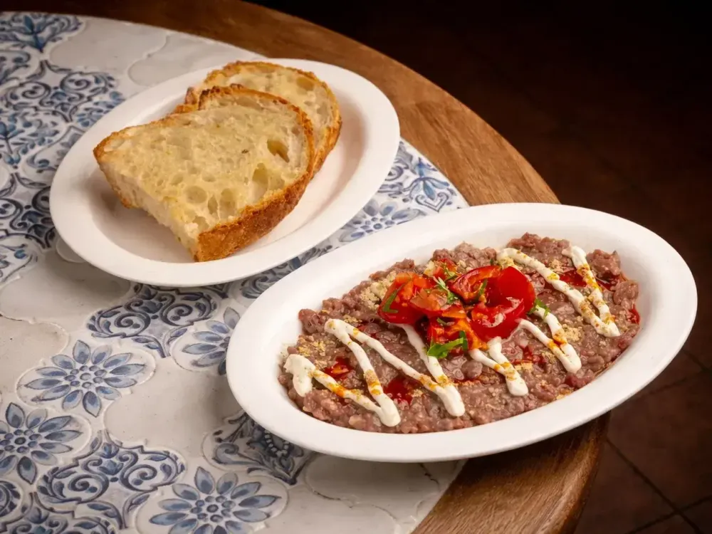 Тартар из говядины, тахини, томаты