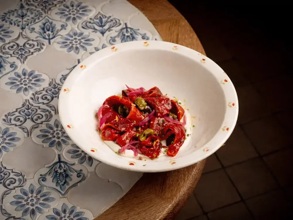Печёный болгарский перец с анчоусами, подаётся с соусом лабне, каперсами и маринованным красным луком. Дополняется свежей зеленью и лёгкой цитрусовой нотой.