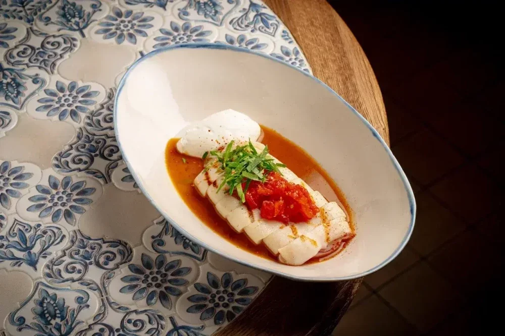 Нежный кальмар-гриль, подается с соусом на основе: аджики, с добавлением чесночно-сливочного масла и BBQ. Украшен томатами конкасе, лабне и петрушкой.