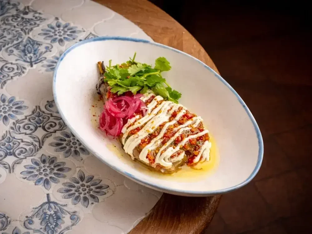 Нежный печёный баклажан с соусом из печёных томатов и кремовым тахини. Украшается маринованным красным луком, кинзой, чесночным маслом и восточными специями.