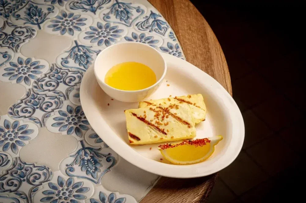 Закуска из жареного сыра халуми. Подается с натуральным медом, обжаренным кунжутом и пикантной ноткой перца шичими. Идеально сочетается с лимонным соком.
