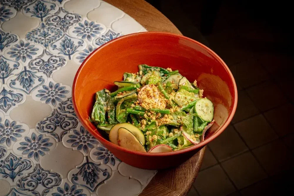 Свежий зелёный салат с авокадо и хрустящими овощами под ореховым соусом кешью-ранч, с кедровыми орешками и лёгкой перчинкой за счет перца шичими.