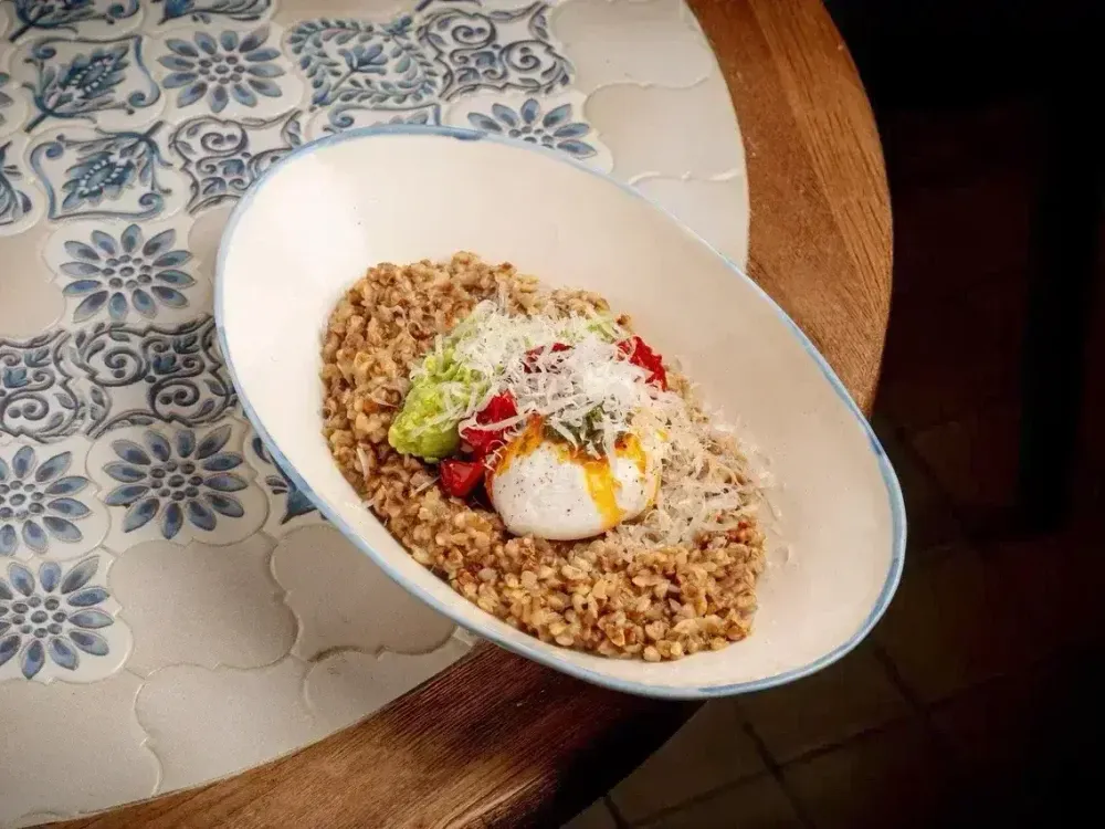 Тёплая гречка с пармезаном и сливочно-чесночным маслом, дополненная мятным авокадо и яйцом пашот. Подаётся с вялеными томатами, зеленью и лёгкой пикантной ноткой специй.