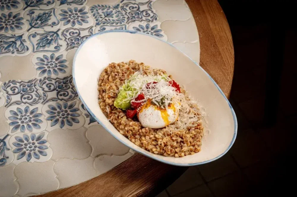 Гречка отварная на воде, сыр пармезан тёртый, масло сливочное-аджика, масло сливочное чесночное, мятый авокадо, яйцо пашот, вяленые томаты черри, лук шнит свежий, специя шичими