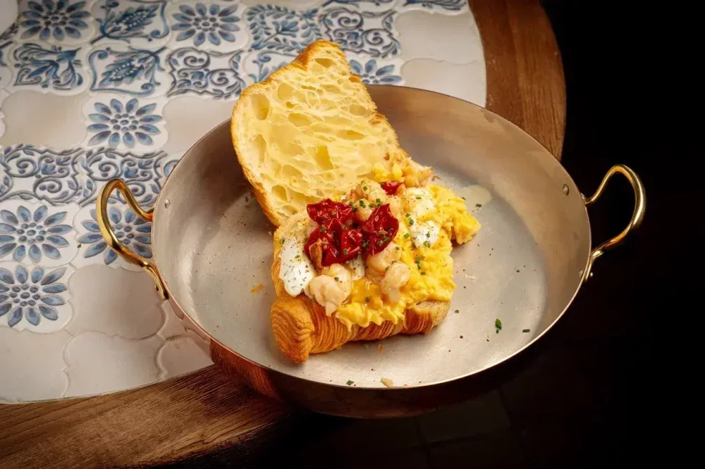 Круассан с креветками и скремблом