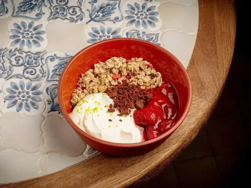 Охлажденный греческий йогурт с добавлением гранолы (овсяные, пшеничные хлопья, сахар, масло растительное, мед, кокосовая стружка, какао-порошок, ячменный солод, бельгийский шоколад, кешью, кунжутные семена). Подаем с клубничным компоте и жареным шоколадом. С пикантной кислинкой благодаря цедре апельсина