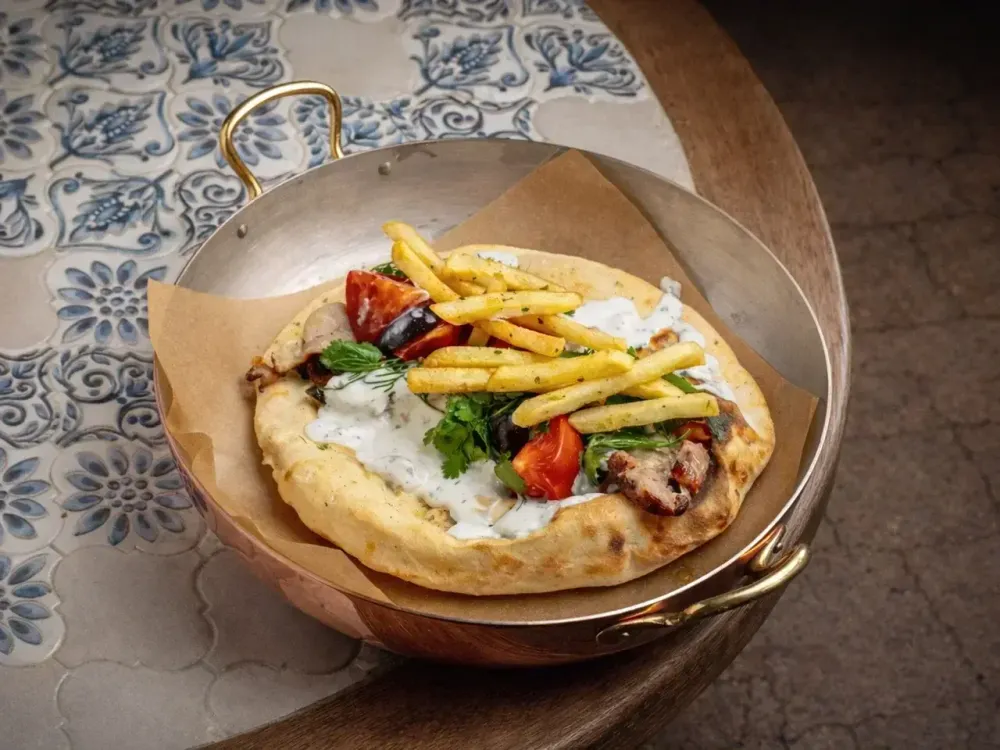Сочное бедро цыпленка на гриле с йогуртовым соусом, свежими овощами (томаты, маринованный красный лук, микс-салат (романо, фриллис), кинзой в мягкой лепешке. Подаем с картофелем фри и восточными специями. Украшаем кунжутом и специями шичими.