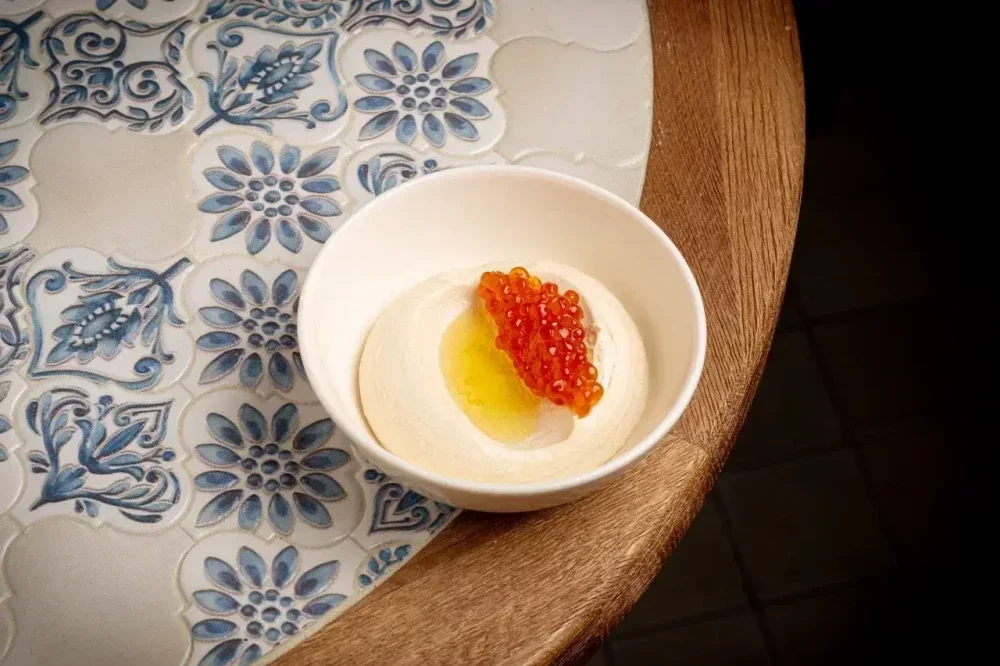 Нежная тарамасалата — классический греческий крем из рыбной икры. Украшена щедрой порцией икры лосося и ароматным копченым оливковым маслом.