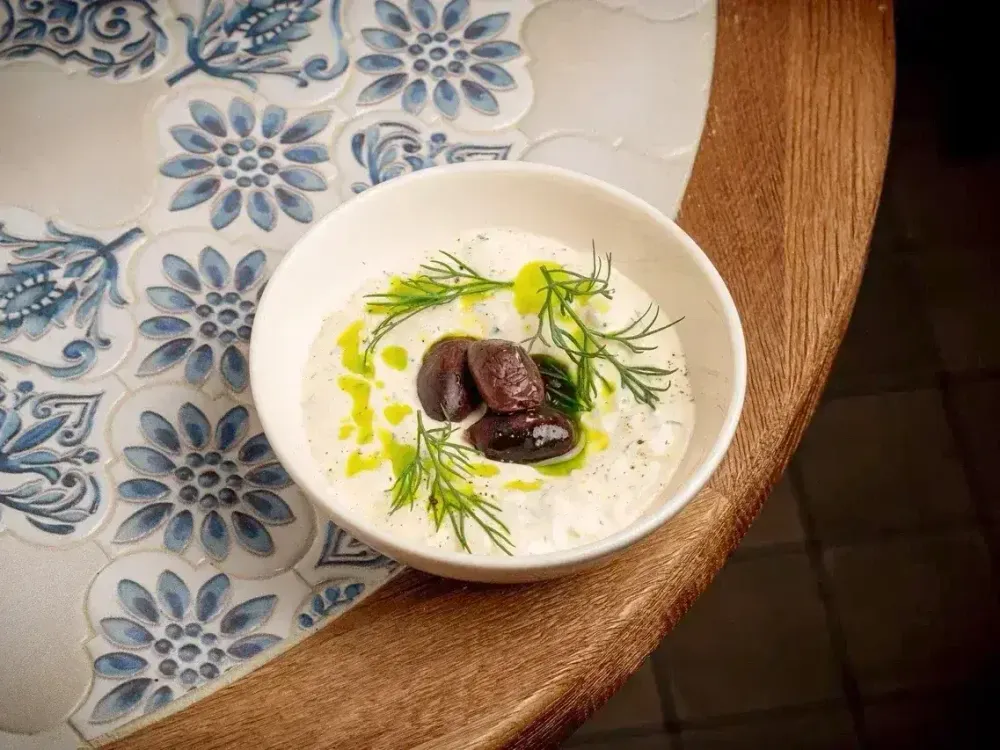 Охлаждающий греческий соус на основе трав и густого йогурта, огурца и чеснока. Подается с оливками Каламата, ароматным зеленым маслом и свежим укропом.