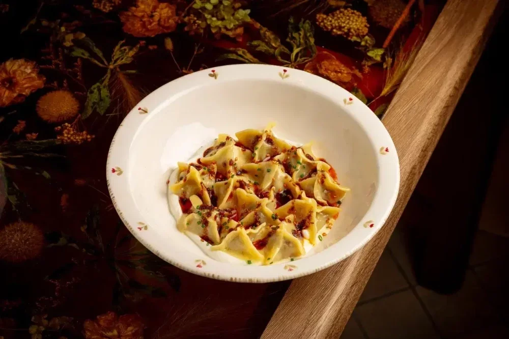 Нежные пельмени с сочной говядиной, подаются с лабне, чесночным маслом и пряным соусом. Украшены кунжутом и сибулетом