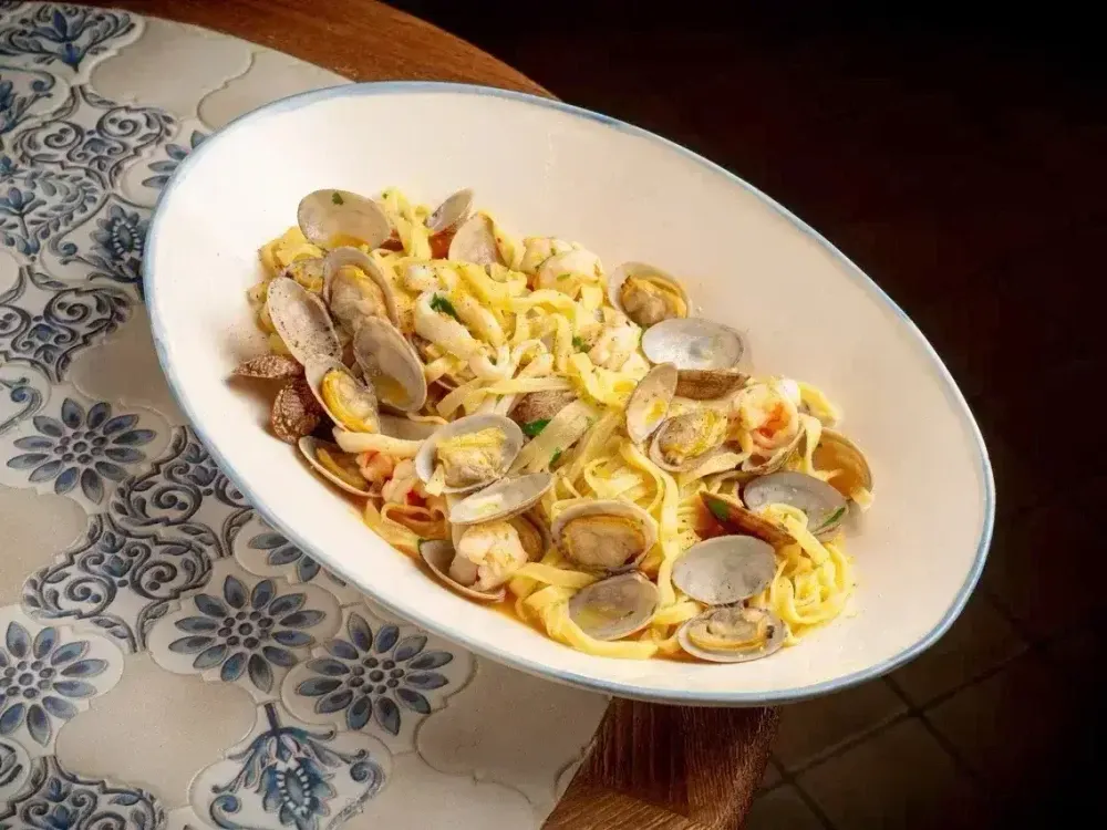 Паста домашнего приготовления с добавлением креветок, кальмаров и вонголе. Сопровождением служит эмульсия из сливочно-чесночного соуса - сверху щепотка хондаши, цедра лимона и лук-сибулет
