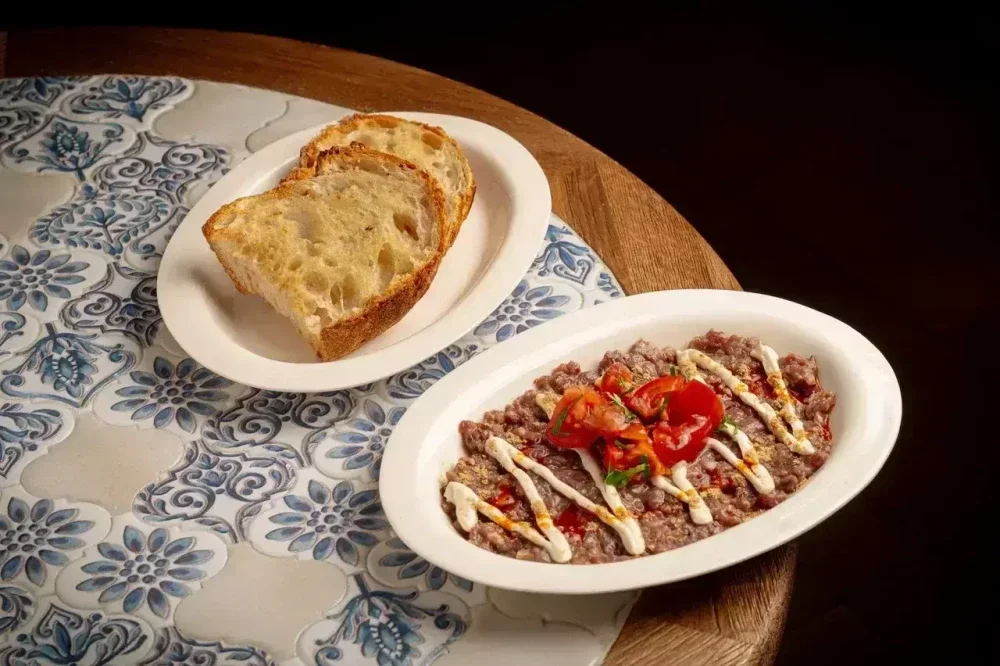 Нежная говядина с заправкой из мёда, зернистой горчицы и копчёного оливкового масла. Подаётся с кремовым соусом тахини, сладкими томатами, маринованным луком и пикантной бастурма-пудрой. Подается с обжаренным тартином