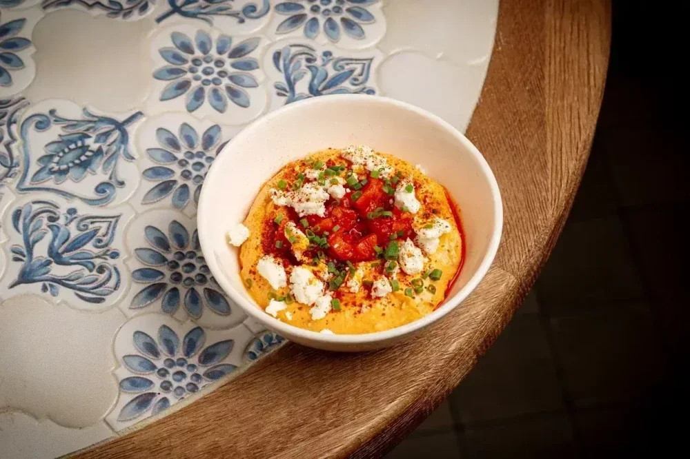 Воздушный мусc на основе феты с дымными нотами печеных перцев. Украшен крошкой феты, кубиками из печеного перца рамиро и тонкими перьями лука сибулет. Финальные акценты — острое масло чили и японская перцевая смесь шичими. Традиционное название блюда ""Терикафтери