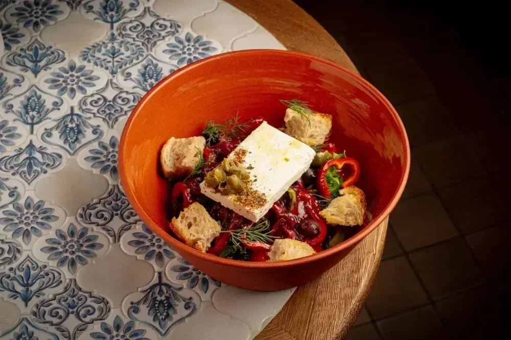 Cочные узбекские томаты, хрустящие огурцы и сладкий перец рамиро. С маринованным красным луком, оливками Каламата и испанскими оливками, крупными кусками феты и чесночными гренками из тартина. С заправкой на оливковом масле с греческими травами и пикантными каперсами.