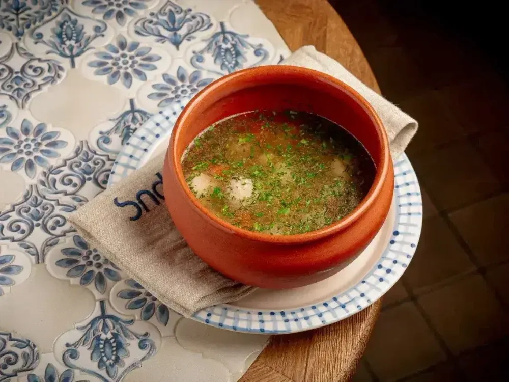 Лёгкий куриный суп на насыщенном бульоне с куриными фрикадельками, орзо и овощами. Дополняется свежей зеленью и лёгкой чесночной нотой.