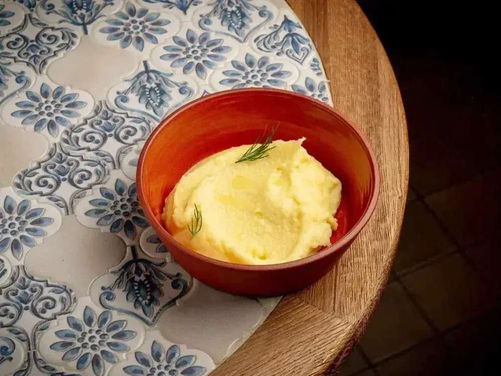 Нежное картофельное пюре (картофель очищенный, вода питьевая, соль морская, сливки 22%) с трюфельным маслом, сливками и чесночным маслом. Подается с зеленью и оливковым маслом