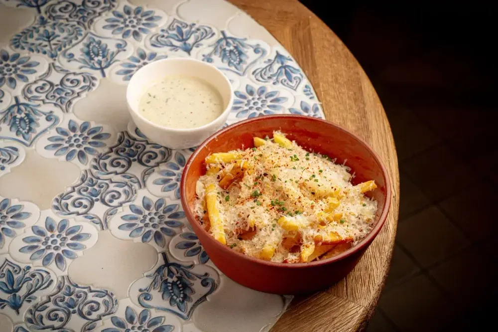 Хрустящий картофель фри с ореховым соусом ранч, пармезаном и греческими специями