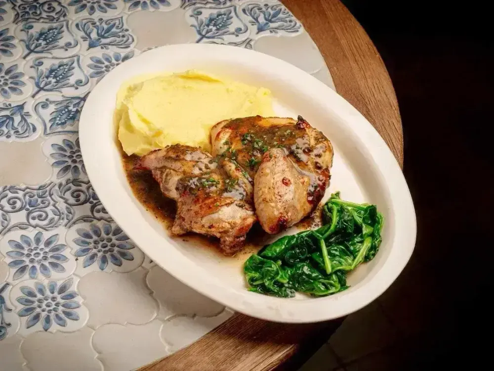 Сочный цыплёнок, приготовленный на гриле, подаётся с нежным картофельным пюре (картофель очищенный, вода питьевая, соль морская, сливки 22%), обжаренным шпинатом и ароматным трюфельным соусом.