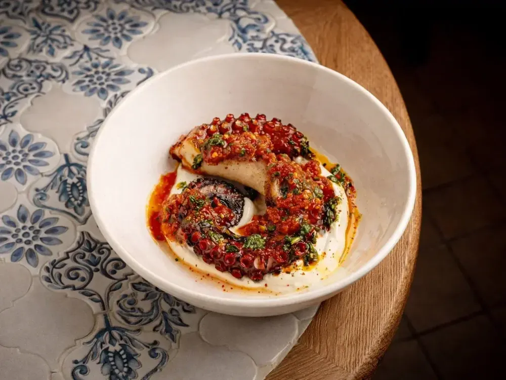 Нежный осьминог, обжаренный в хоспере, с ореховым соусом тахини и соусом из печёных томатов. С зеленым чимичурри и легкой остротой шичими.