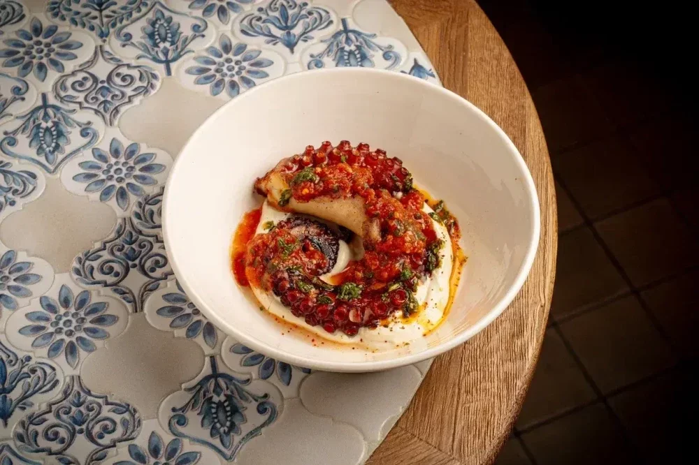 Нежный осьминог обжаренный в хоспере с ореховым соусом тахини и соусом из печёных томатов. С зеленым чимичурри и легкой остротой шичими.