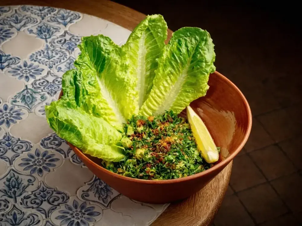 Cвежая мята, петрушка, кинза, нежное авокадо и хрустящий лук. Заправляем фирменным соусом с лимоном, перцем шичими и мелко нарубленным кедровым орехом.