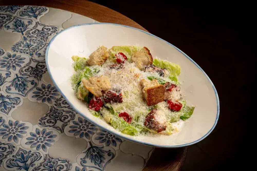 Отварной осьминог, хрустящий ромейн и вяленые томаны. Все это под классической заправкой, с ноткой чеснока, пармезаном и тартином.