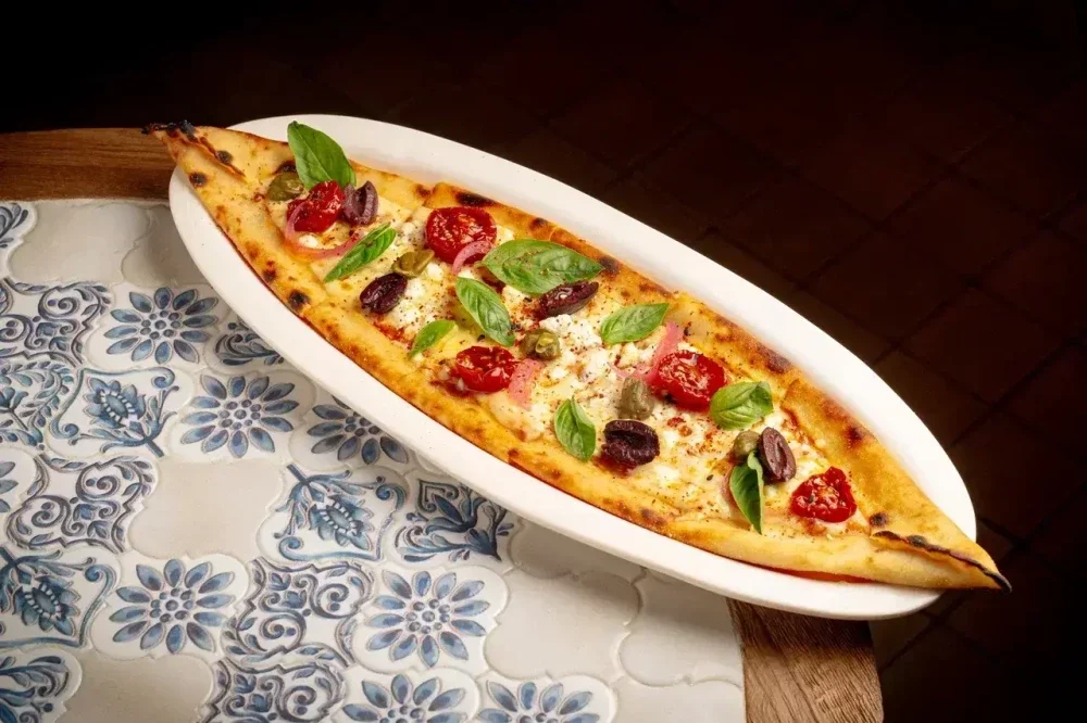 Традиционная турецкая лепешка с начинкой из соуса печеных томатов, сырной смеси и феты. Украшена вялеными томатами, оливками Каламата, маринованным луком и каперсами. Сбрызнута чесночным маслом с щепоткой шичими (35 см).