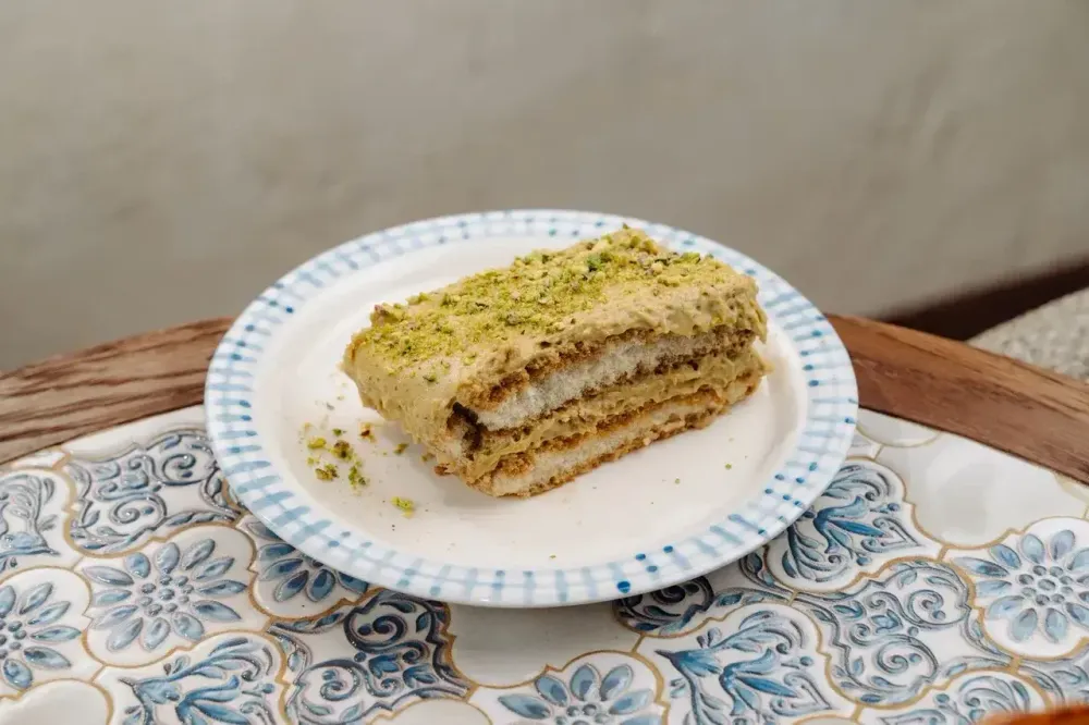 Нежный десерт на основе классического итальянского тирамису, с добавлением фисташковой пасты. Лёгкий крем маскарпоне соединяется с пропитанным кофе савоярди, создавая идеальный баланс текстур.