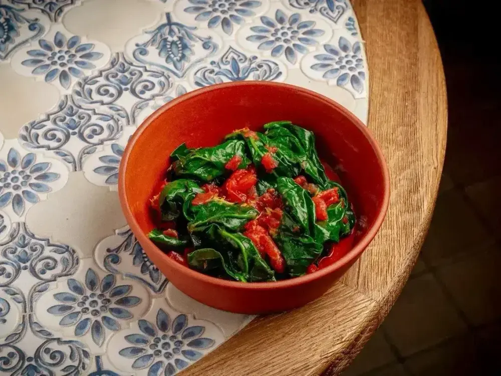 Свежий шпинат с томатами. Приготовлен с чесночным маслом и соусом BBQ, с ароматом лимонной цедры и кунжута.