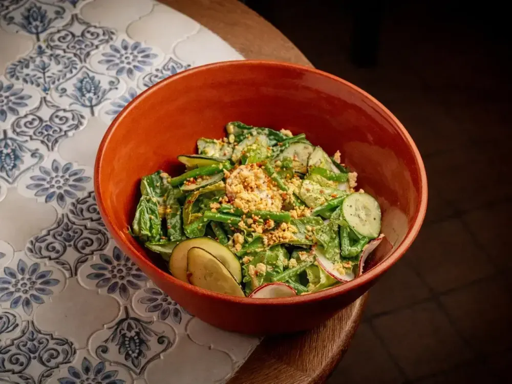 Свежий зелёный салат с огурцом, цукини, стручковой фасолью и редисом, на основе ромена, шпината и фриллиса. Дополняется авокадо, кешью и кедровыми орехами, с лёгкой остротой шнитт-лука.