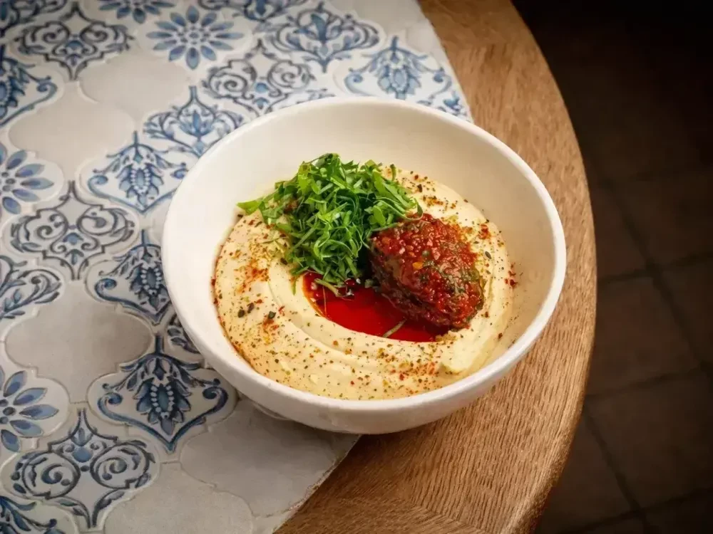 Нежный, кремовый хумус, украшенный яркой сальсой из вяленых томатов. Игра текстур и контрастов: мягкая основа, пикантные томаты и деликатная острота масла из чили с щепоткой японской перцевой смеси Шичими.