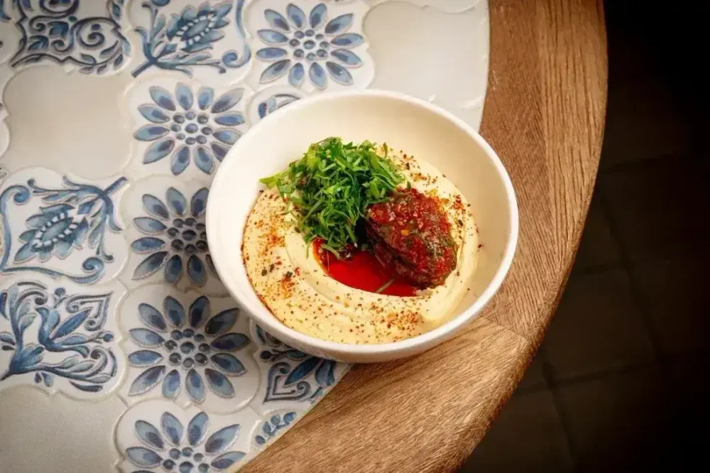 "Нежный, кремовый хумус, украшенной яркой сальсой из вяленых томатов. Игра текстур и контрастов: мягкая основа, пикантные томаты и деликатная острота масла чили с щепоткой японской перцевой смеси Шичими.