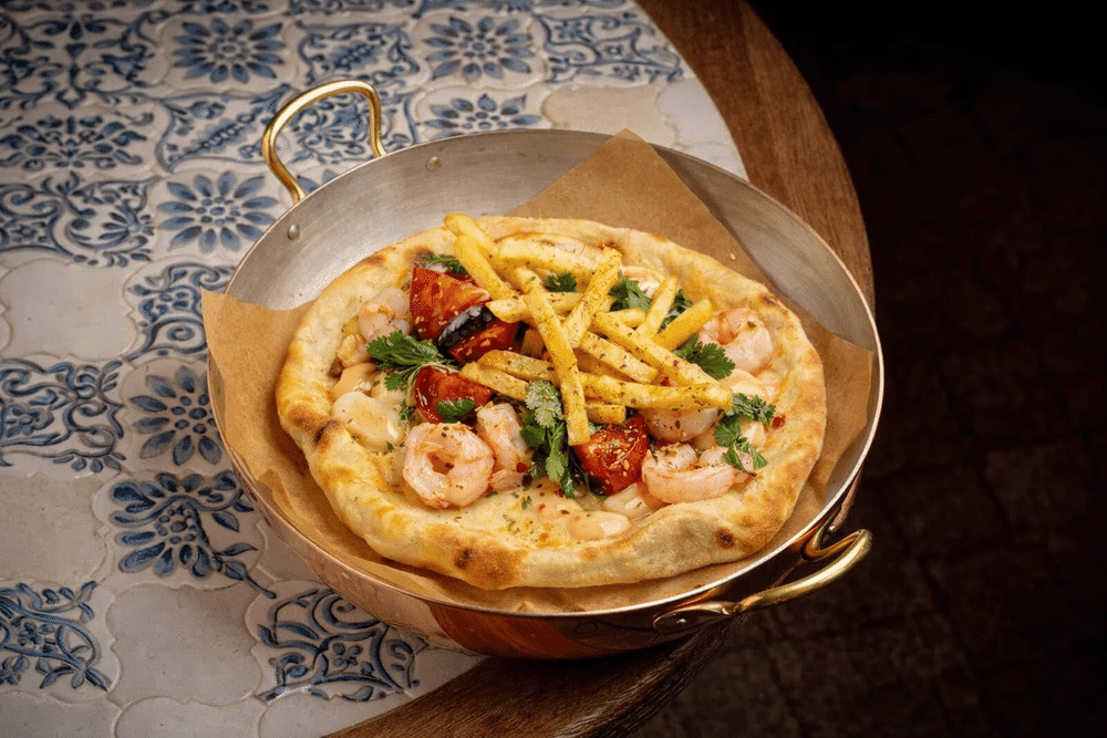 Креветки поджаренные на гриле с чесночным маслом в мягкой лепешке с соусом айоли харисса. Подаем со свежими овощами и картофелем фри. Посыпаем кунжутом и специей шичими