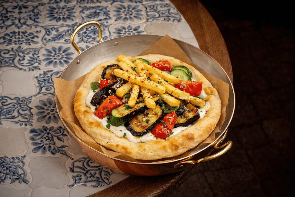 Цукини, баклажан и перец сладкий перец рамиро обжаренные на гриле с греческими травами в мягкой лепешке с йогуртовым соусом.Подаем со свежими овощами и картофелем фри. Посыпаем кунжутом и специей шичими