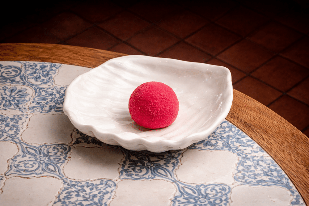 Трюфель из молочного шоколада с нежным йогуртовым ганашем и лёгкой цитрусовой нотой апельсиновой цедры. Сбалансирован по вкусу с помощью сливок и щепотки морской соли. Снаружи покрыт сублимированной малиной, придающей яркую ягодную кислинку (1 шт.).
