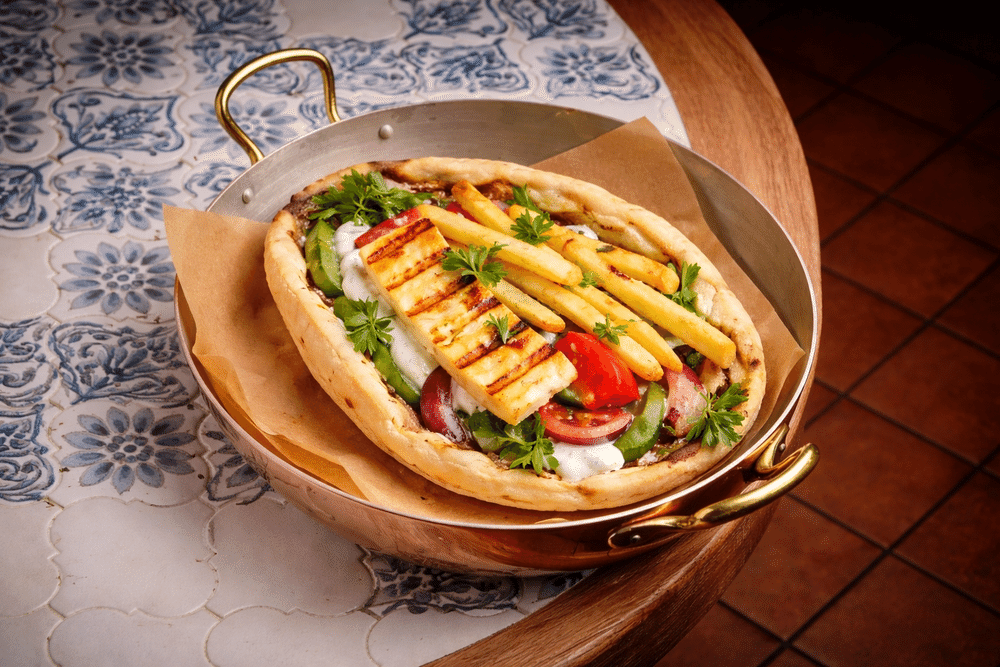 Сыр Халуми на гриле с йогуртовым соусом, свежими овощами и зеленью в мягкой лепешке. Подаем с картофелем фри и восточными специями. Украшаем кунжутом и специями шичими.