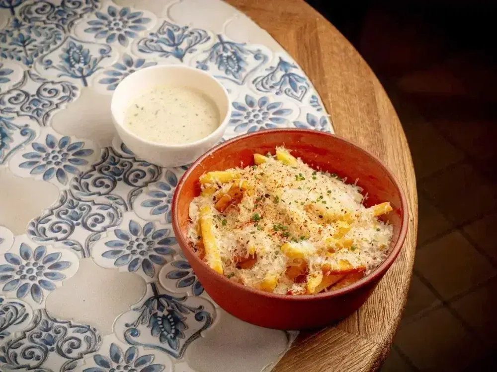 Хрустящий картофель фри с ореховым соусом ранч, пармезаном и греческими специями